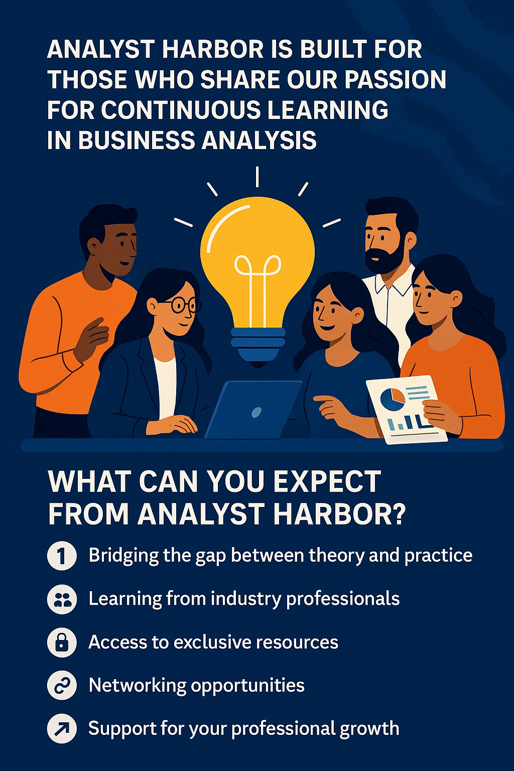 Analyst Harbor is built for those who share our passion for continuous learning in business analysis. It’s more than just a platform—it’s a thriving community where professionals come together to bridge the gap between theory and practice, exchange real-world insights, and grow through shared knowledge and collaboration.